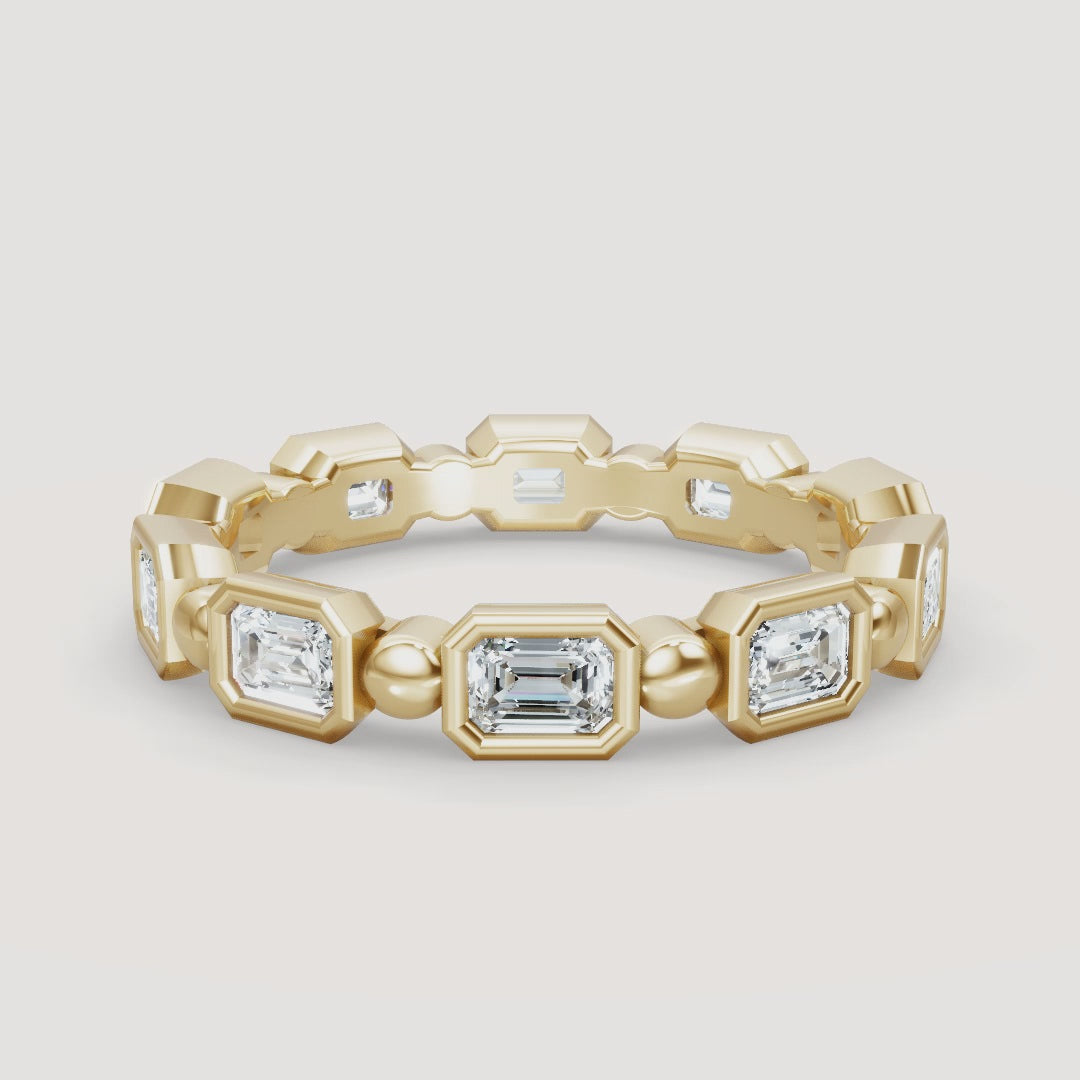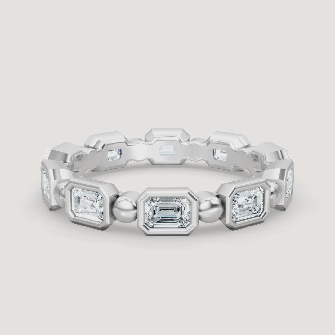 This eternity band features emerald-cut stones (approximately 1 carat total weight), in full bezel settings, set east-west and alternating with delicate bead details for a modern and refined design. This versatile band can be worn as a wedding band, stacking band, or a standalone piece.