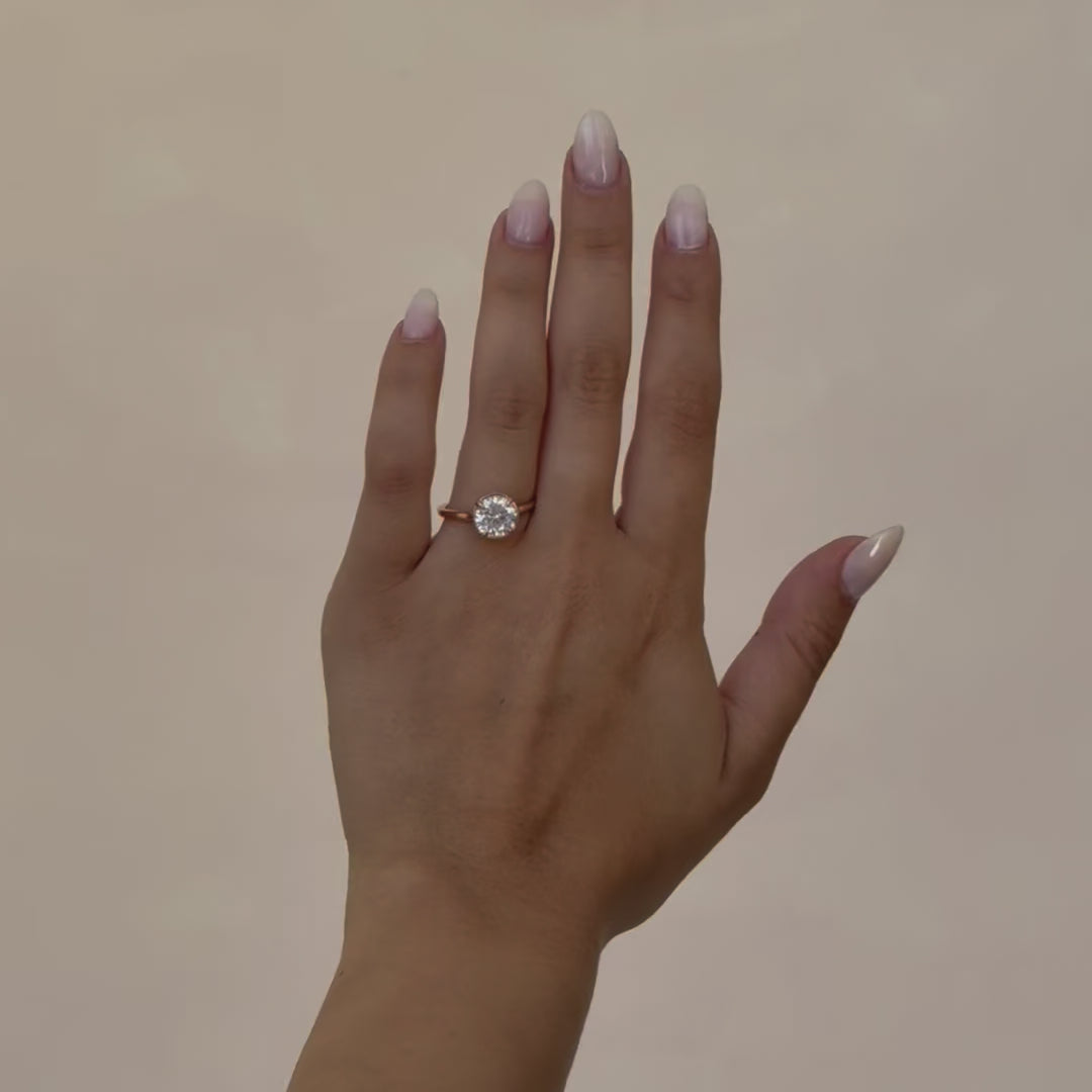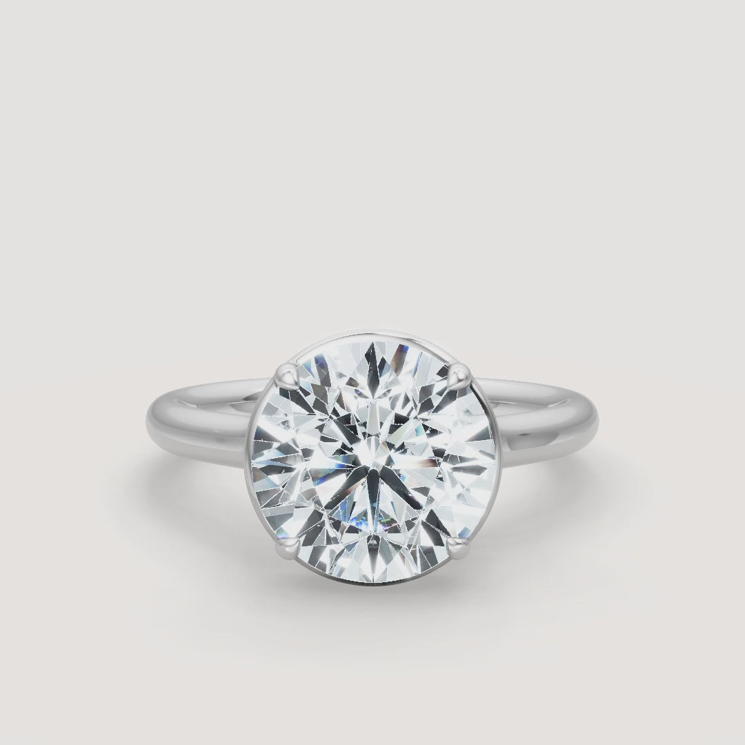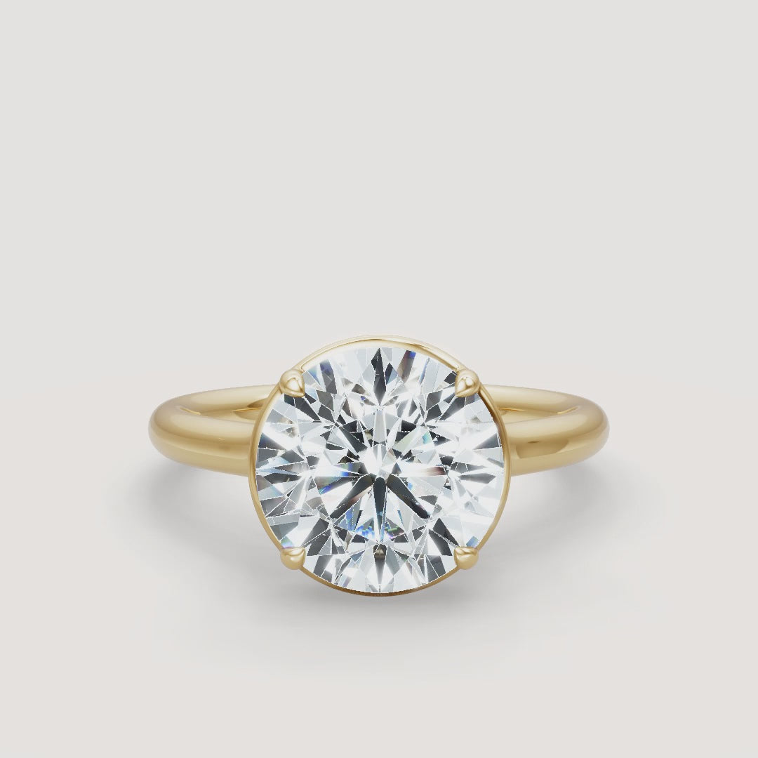This floating bezel solitaire ring features a softly rounded band with small prongs securing the center stone. The bezel design offers a modern, sleek aesthetic while providing added durability and security, with the small prongs enhancing its delicate appearance.