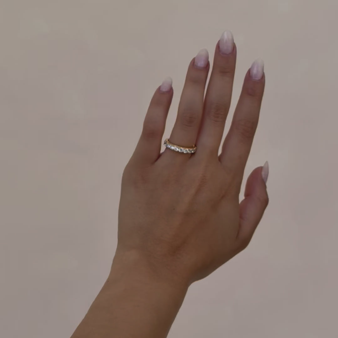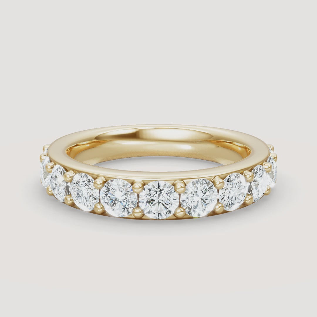 This classic band features round stones (approximately 1.49 carats total weight) in a shared prong setting, designed to maximize brilliance and sparkle. Available in 14k yellow gold, 14k white gold, 14k rose gold, and Platinum.