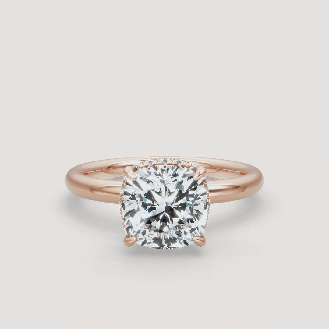 This timeless solitaire ring features a double hidden halo of round stones (approximately .20 carats total weight), adding subtle brilliance to the classic design. Perfect for those seeking an elegant twist on a traditional style.