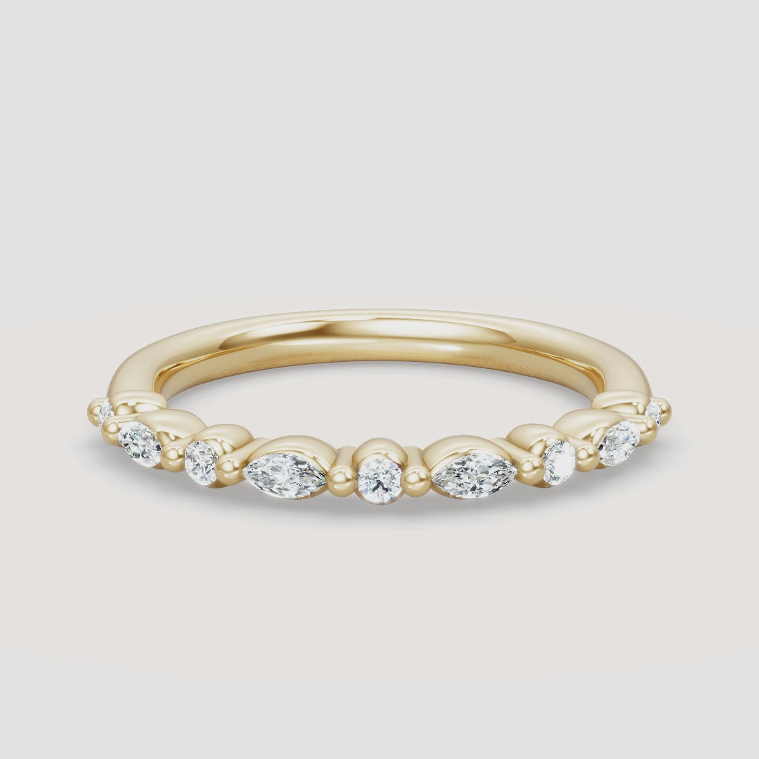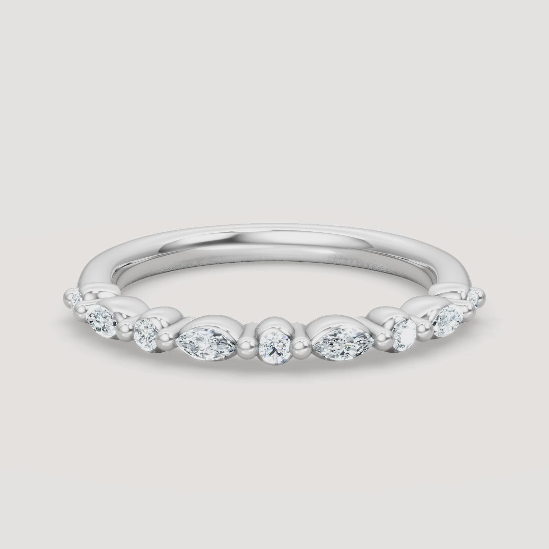 This classic band features a combination of marquise and round stones (approximately .23 carats total weight), creating a delicate and timeless design. Perfect as a wedding band, anniversary band, or stacking piece.