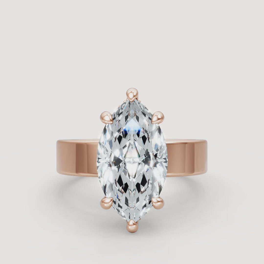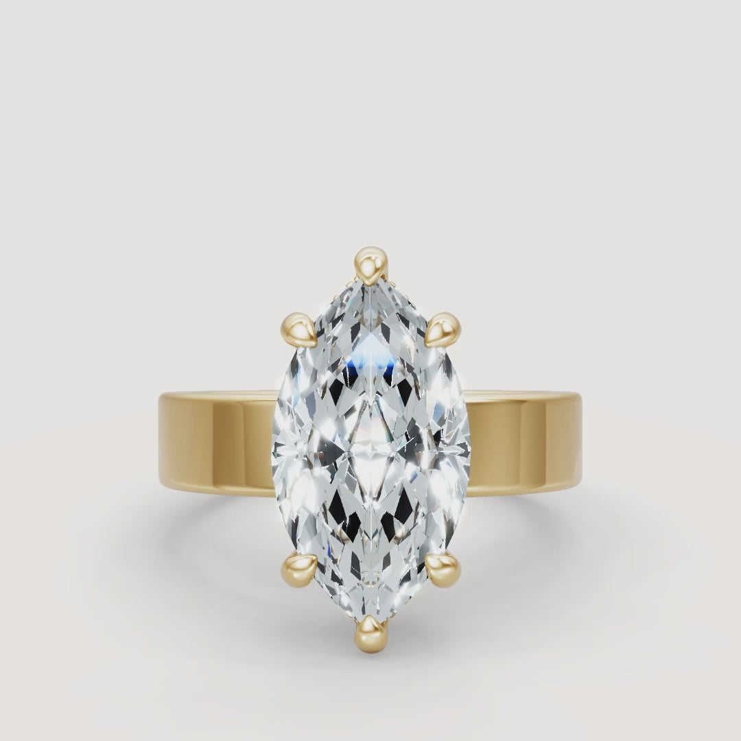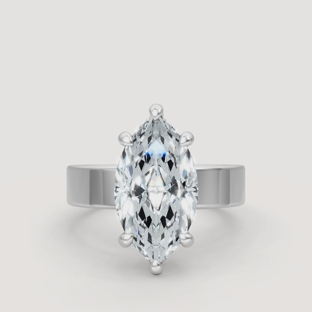 This bold wide band engagement ring features a sleek and contemporary design with a basket setting and a hidden halo of round stones (approximately .10 carats total weight) that securely holds the center stone. The flat wide band adds a statement-making touch, combining modern sophistication with timeless elegance.