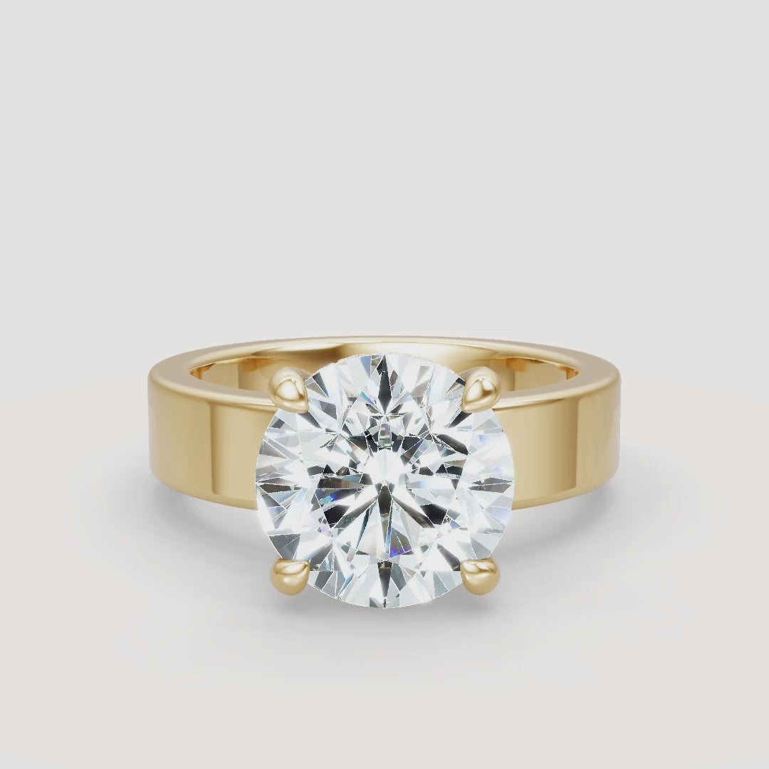 This bold wide band engagement ring features a sleek and contemporary design with a basket setting and a hidden halo of round stones (approximately .10 carats total weight) that securely holds the center stone. The flat wide band adds a statement-making touch, combining modern sophistication with timeless elegance.