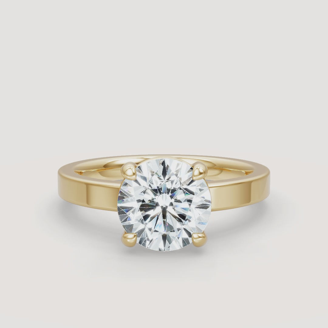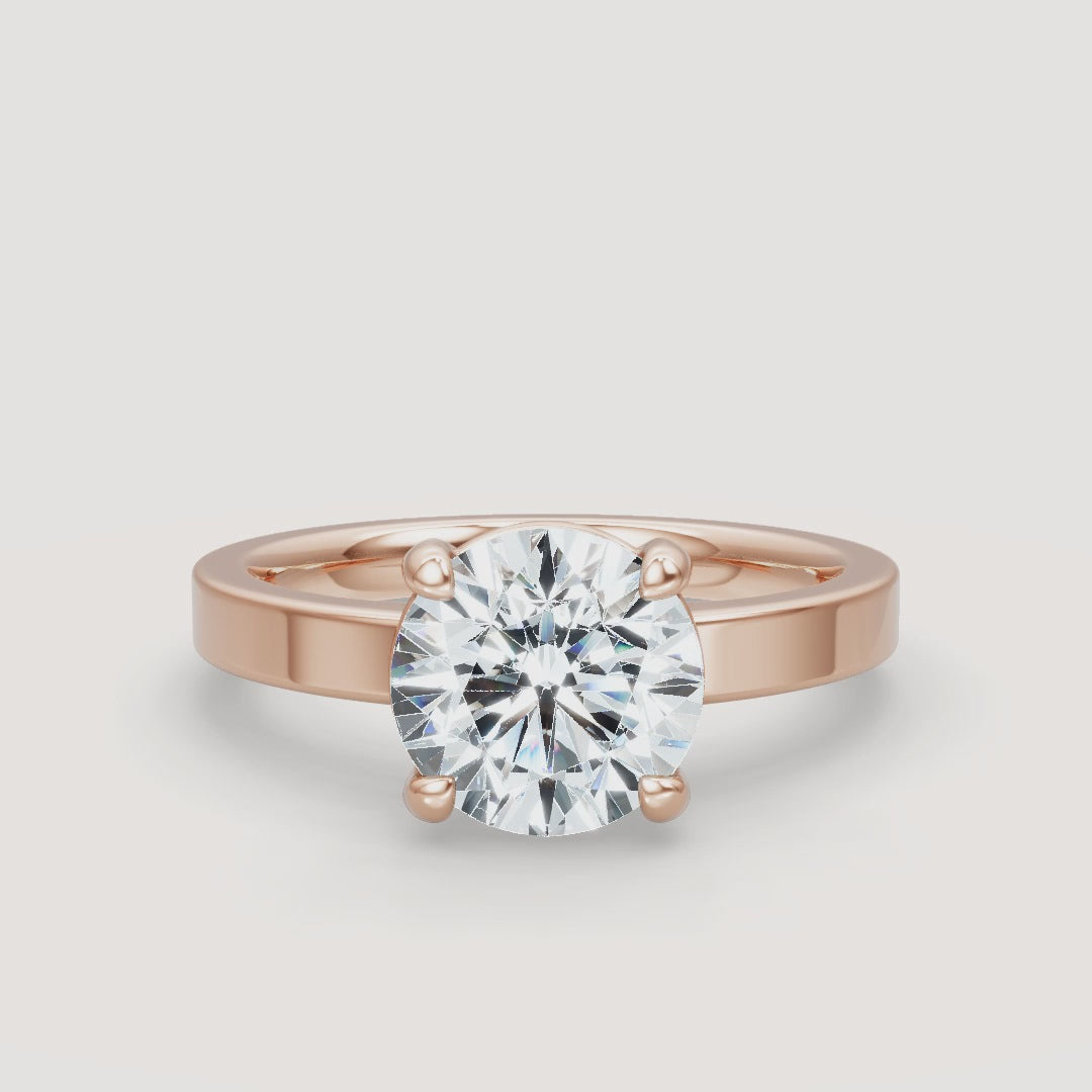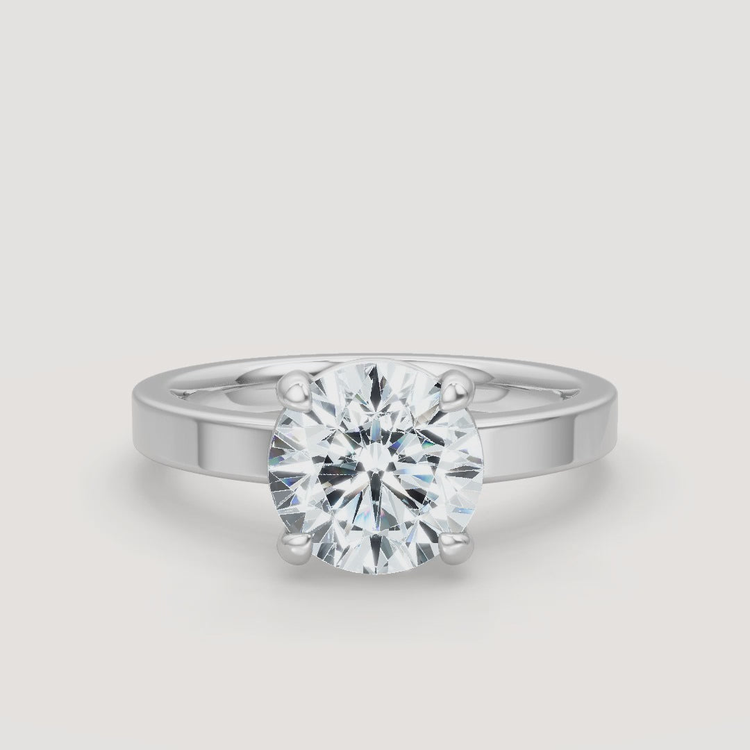 This flat band solitaire ring features a sleek and modern design with a basket setting to securely showcase the center stone. Its bold band adds a contemporary edge to a timeless style.