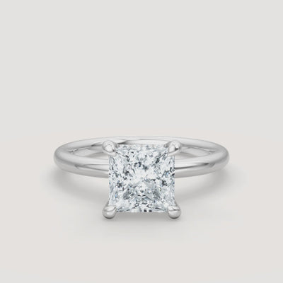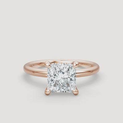 This classic solitaire ring offers timeless simplicity and elegance, while adding a modern twist. It features a hidden halo of round stones and additional stones elegantly set along the prongs (approximately .14 carats total). The design adds subtle sparkle from every angle, making it perfect as an engagement ring or a sophisticated statement piece.