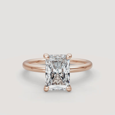 This classic solitaire ring offers timeless simplicity and elegance, while adding a modern twist. It features a hidden halo of round stones and additional stones elegantly set along the prongs (approximately .14 carats total). The design adds subtle sparkle from every angle, making it perfect as an engagement ring or a sophisticated statement piece.