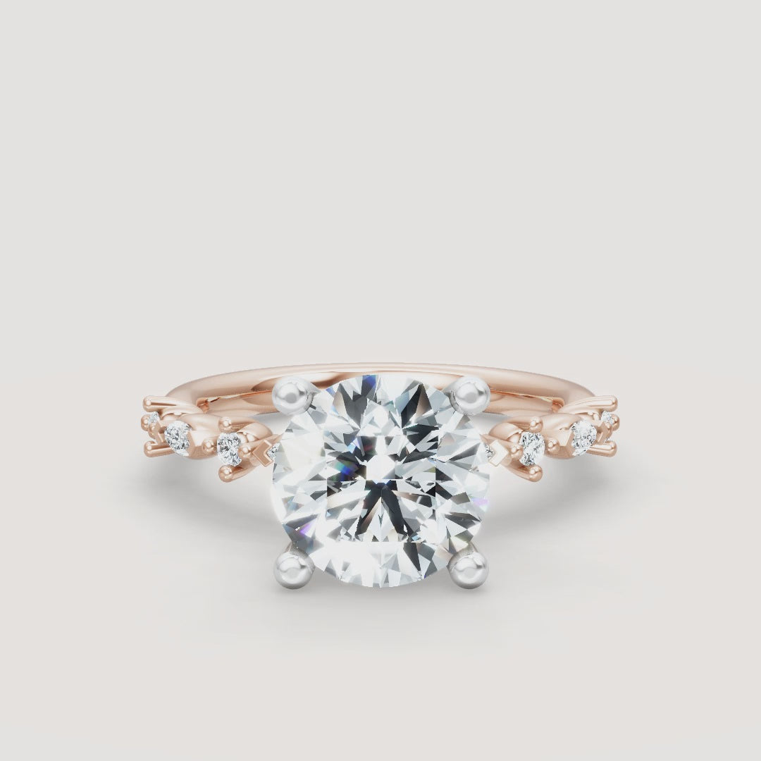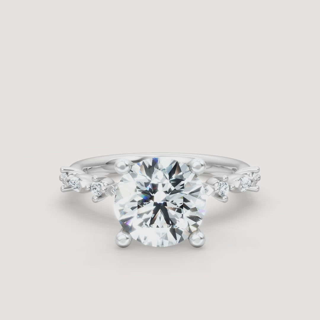 This engagement ring features marquise and round accent stones halfway around the band (approximately .16 carats total weight), offering a delicate and sophisticated touch. The center stone is set in your choice of a Platinum or White Gold head, ensuring a seamless and timeless design.