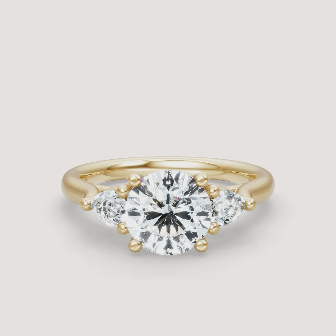 This elegant three-stone engagement ring features pear-shaped side stones (approximately .40 carats total weight) that beautifully frame the center stone. The cathedral setting adds height and grace, creating a timeless design that enhances the brilliance of the stones.
