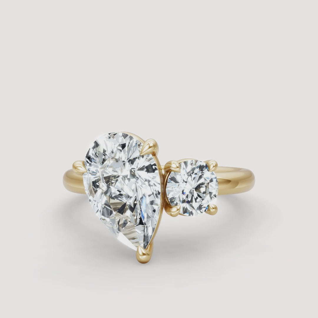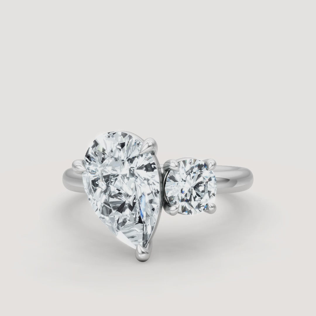 This elegant Toi et Moi ring features a stunning combination of a pear-cut stone and a round stone. Perfect as an engagement ring or statement piece, it offers a timeless and sophisticated look.